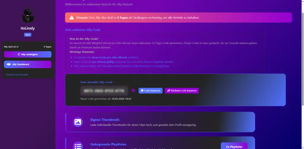 Lynxia Ally gibt es jetzt schon eine längere zeit und meine Idee ist es mehr Vorteile zu geben für Lynxia Ally Nutzer. Eine Möglichkeit wird es sein Codes an Freunde weiterzugeben die man 1x pro Abo Monat bekommt. Diese Codes können dann einem Kumpel 14 Tage Ally geben.